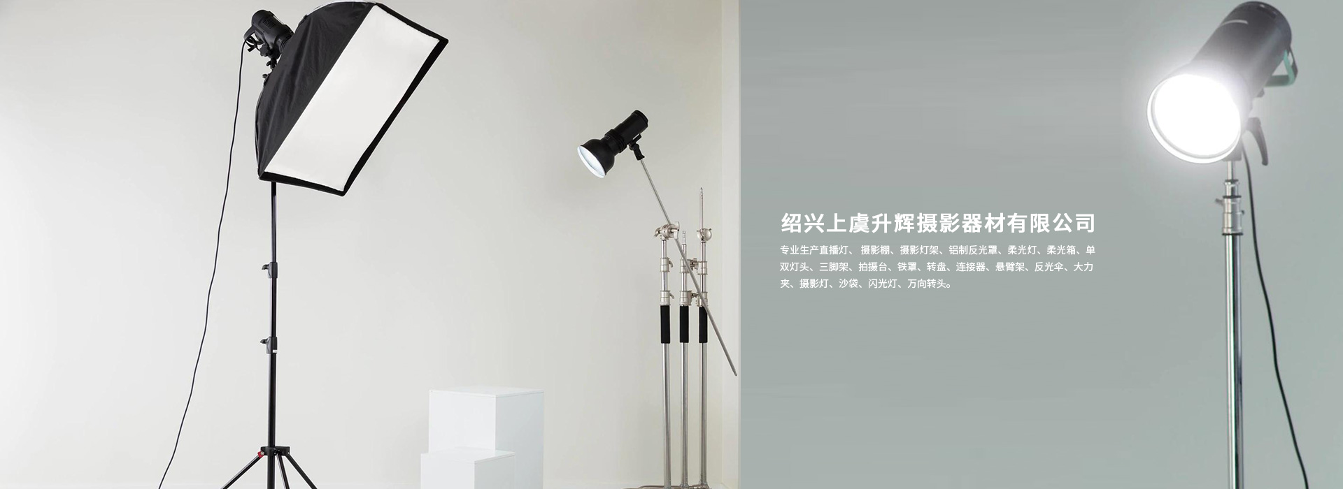 紹興上虞升輝攝影器材有限公司專業(yè)生產(chǎn)直播燈、 攝影棚、攝影燈架、鋁制反光罩、柔光燈、柔光箱、單雙燈頭、三腳架、拍攝臺(tái)、鐵罩、轉(zhuǎn)盤、連接器、懸臂架、反光傘、大力夾、攝影燈、沙袋、閃光燈、萬向轉(zhuǎn)頭。